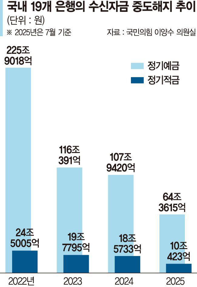 1일 파이낸셜뉴스가 국민의힘 이양수 의원실을 통해 금융감독원에서 입수한 '연도별 개인·개인사업자 정기예·적금 중도해지 금액'에 따르면 올해 1~7월 개인 및 개인사업자가 중도해지한 정기적금 금액은 10조423억원, 정기예금은 64조3615억원으로 각각 집계됐다.