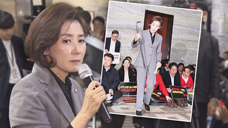 나경원 당시 원내대표가 바로 저렇게 공사장에 쓰는 저 연장을 한 손에 들고 마치 노획한 전리품처럼 들고 있다 보니까 여러 사진을 찍힌 상황인 것이죠.