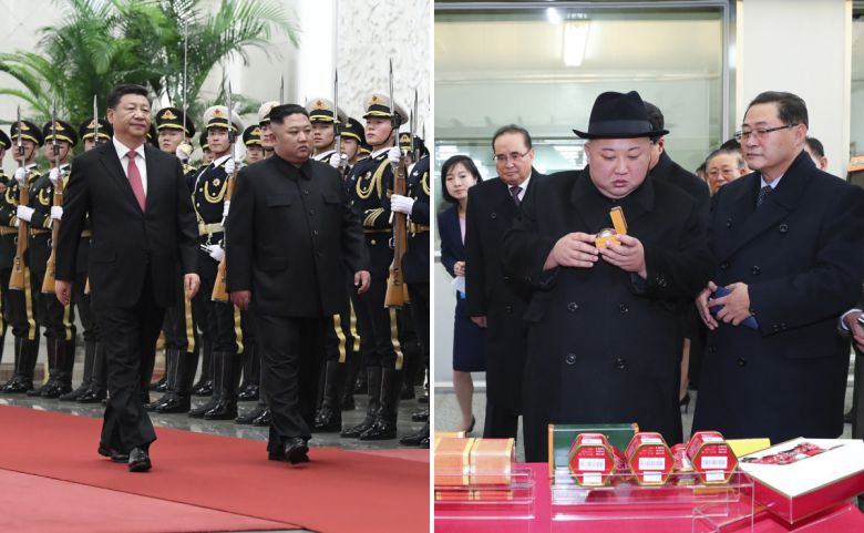 2019년엔 시진핑 만나고 제약공장 방문 김정은 북한 국무위원장이 2019년 1월8일 중국 방문 당시 베이징 인민대회당에서 열린 공식 환영행사에서 시진핑 중국 국가주석과 함께 인민해방군을 사열하고 있다(왼쪽 사진). 김 위원장이 다음날 부인 리설주 여사와 함께 베이징 외곽의 경제기술개발구에 있는 제약기업 공장을 둘러보고 있다. AP연합뉴스