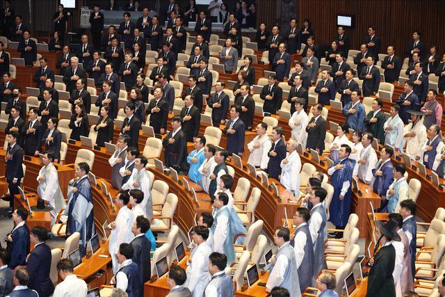 반면 국민의힘 의원들은 이날 검은색 옷차림에 ‘근조-의회 민주주의’라 적힌 검은 리본을 왼쪽 가슴에 달고 본회의장에 들어왔다. 이들은 “의회 민주주의를 말살하는 이재명 정권 독재정치에 맞서자는 심기일전의 취지”(송언석 원내대표)로 상복을 입었다고 했다.