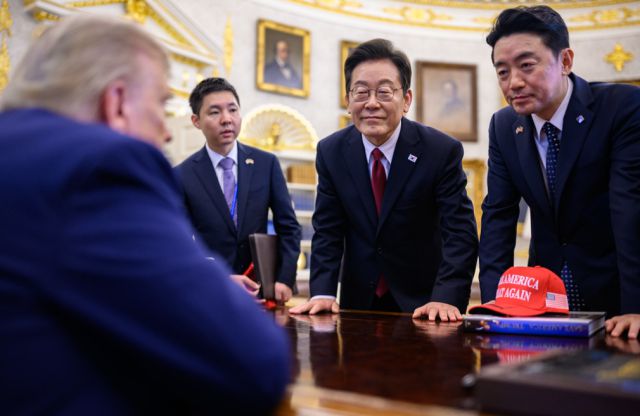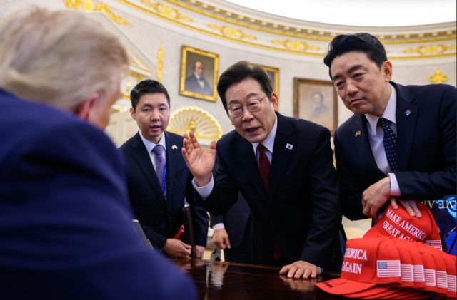 미국 백악관이 지난달 25일 한미정상회담 미공개 사진을 온라인에 공유했다. 사진 중에는 이재명 대통령과 강훈식 비서실장이 이른바 ‘결단의 책상’에 앉은 트럼프 앞에 서서 설득하는 듯한 장면도 담겼다.