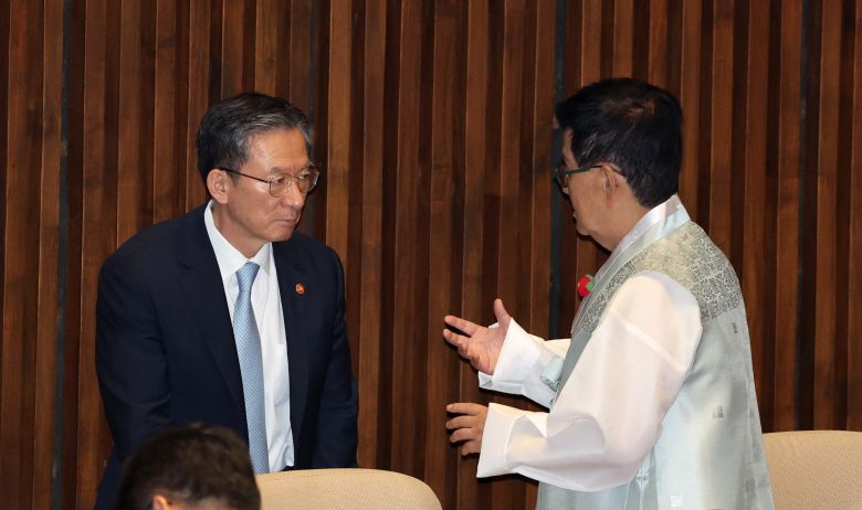 박지원 더불어민주당 의원이 1일 오후 서울 여의도 국회에서 열린 제429회 국회(정기회) 개회식에서 정성호 법무부 장관과 대화하고 있다. /뉴스1 |