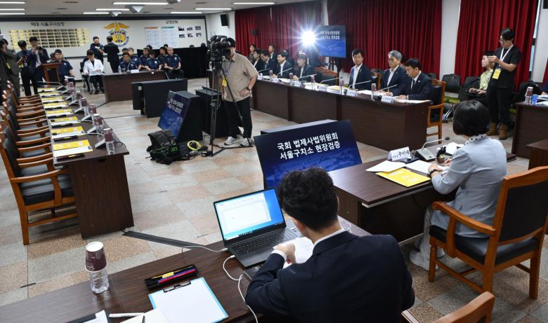국힘 빠진 채… 법사위, 서울구치소 현장검증 1일 경기 의왕시 서울구치소에서 국회 법제사법위원회의 현장 검증이 진행되고 있다. 이날 더불어민주당·조국혁신당 소속 법사위원들은 김건희 특검의 체포영장 집행에 윤석열 전 대통령이 불응한 과정을 확인하기 위해 구치소 내 폐쇄회로(CC)TV 영상을 시청했다. 국민의힘 법사위원들은 현장 검증에 불참했다. 사진공동취재단 |