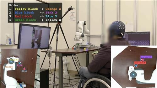 '인공지능-뇌·컴퓨터 인터페이스'(AI-BCI) 시스템 실험 척수마비로 다리가 마비된 실험 참가자가 인공지능-뇌·컴퓨터 인터페이스(AI-BCI) 시스템을 사용해 지시대로 로봇팔로 블록 4개를 집어서 옮기는 과제(pick-and-place)를 수행하고 있다. [Johannes Lee, Jonathan Kao, Neural Engineering and Computation Lab/UCLA 제공. 재판매 및 DB 금지]
