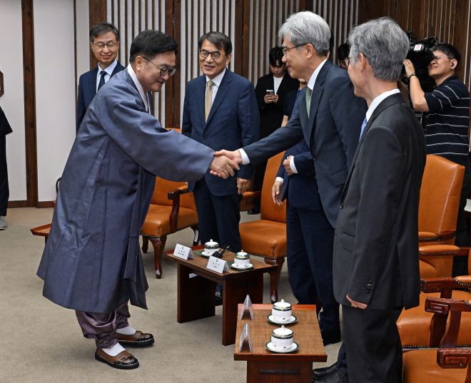 한복 차림의 우원식(왼쪽) 국회의장이 1일 서울 여의도 국회에서 열린 정기국회 개회식에 앞서 김상환 헌법재판소장과 악수하며 인사를 나누고 있다. 우 의장 뒤쪽으로 왼쪽부터 최재해 감사원장, 노태악 중앙선거관리위원장. 국회사진기자단 |