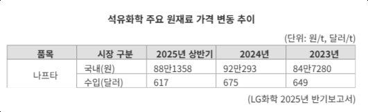 특히 ABS·SSBR 제품은 북미 수요가 꾸준한 품목으로 현지 영업조직 강화를 통해 시장 확대도 추진 중이다. 여기에 납사 가격 하락도 긍정적으로 작용하고 있다. 한국 기준 t당 납사 평균 가격은 88만1358원으로, 전년 동기 대비 4.3% 하락하며 원가 부담을 줄이고 있다.