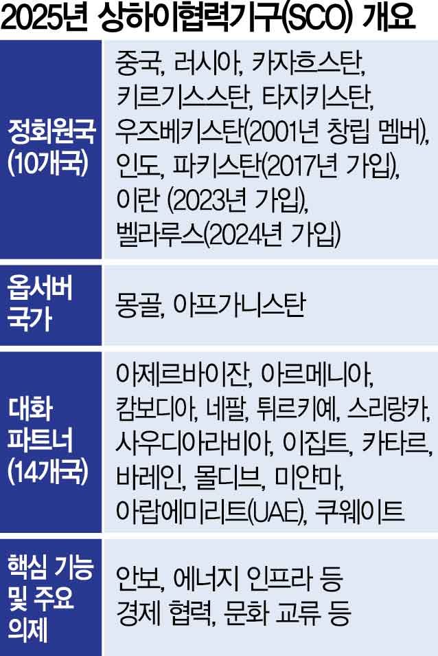 SCO 회원국 및 참여국은 전 세계 인구의 절반, GDP의 4분의 1을 차지합니다. 지난해 중국과 SCO 회원국 무역액은 설립 당시 대비 36.3배 증가한 3조 6500억 위안에 달했습니다. 트럼프의 관세전쟁으로 반서방 국가들이 중국 우산 아래 결속하며 SCO는 경제안보 동맹으로 발전하고 있습니다. 아울러 다가올 3일 전승절 80주년 열병식에서는 중국을 중심으로 한 안보 동맹의 세를 전 세계에 과시할 것으로 전망됩니다.