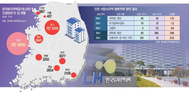 1일 LH에 따르면 LH가 관리 중인 전국 건설임대 주택 98만 2867가구 가운데 6개월 이상 임차인을 찾지 못한 주택이 3만 9889가구에 달하는 것으로 나타났다. 경기도에서만 빈집이 1만 3268가구에 달한 가운데 서울(407가구)과 인천(867가구) 등에서도 빈집이 수백 채 존재했다. 또 충남(5841가구), 전북(3202가구), 경남(2654가구), 경북(2150가구), 부산(2109가구) 등에서 빈집이 수천 가구 규모로 집계됐다.