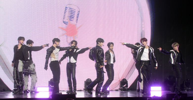 그룹 제로베이스원(김규빈, 김지웅, 석매튜, 한유진, 장하오, 성한빈, 김태래, 리키, 박건욱)이 1일 서울 용산구 블루스퀘어에서 열린 정규 1집 ‘네버 세이 네버(NEVER SAY NEVER)’ 발매기념 쇼케이스에서 열창하고 있다.김두홍 기자 |