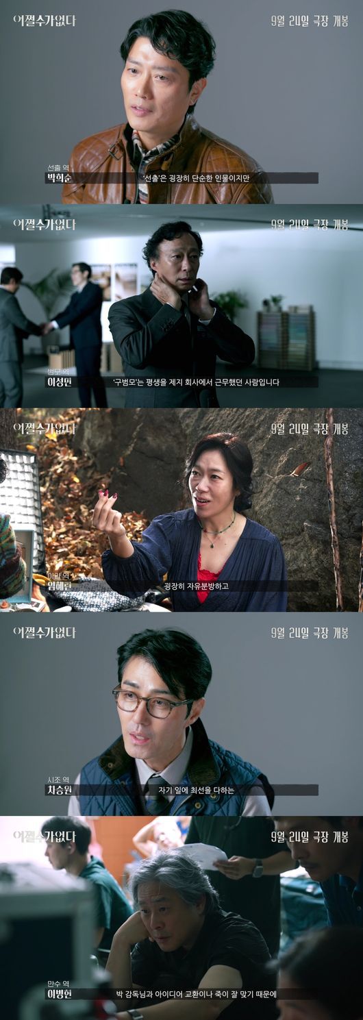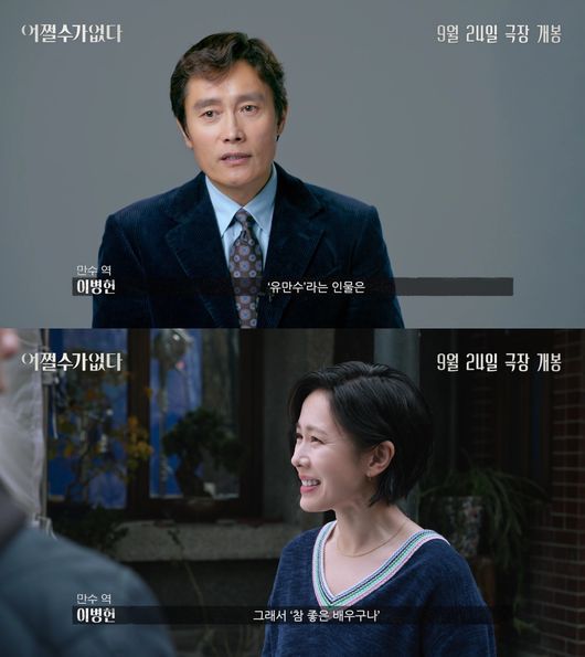 ‘아라’ 역의 염혜란은 “지금까지 한 번도 연기해 보지 못한 새로운 캐릭터다. 자유분방하고, 본능에 충실하다”, ‘시조’로 분한 차승원은 “자기 일에 최선을 다하는 평범한 가장이다”라고 전해 다채로운 캐릭터들이 선보일 시너지를 예고한다. 마지막으로 이병헌은 “감독님과 늘 새로운 아이디어에 대해 많은 이야기를 하며 촬영했다”고 박찬욱 감독과의 호흡을 전했다. 이처럼 영화의 비하인드 스토리를 담은 액터스 컷 영상을 공개한 '어쩔수가없다'는 배우들의 눈부신 열연으로 올가을 극장가에 훈풍을 불어넣을 전망이다. 오는 24일 개봉.