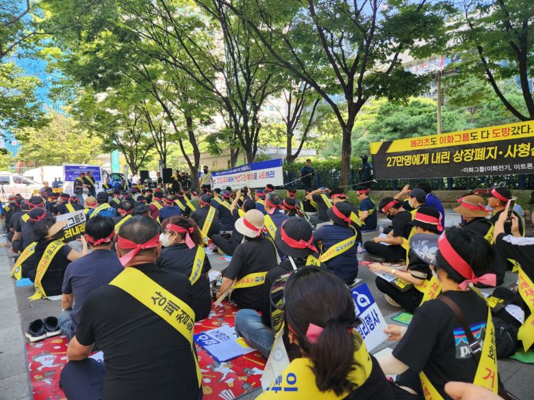 2023년 9월 8일 서울 여의도 한국거래소 앞에서 이화그룹주 소액주주연대가 ‘이화그룹주 거래 중지 해제 촉구 집회’를 열고 있다. /조선비즈DB
