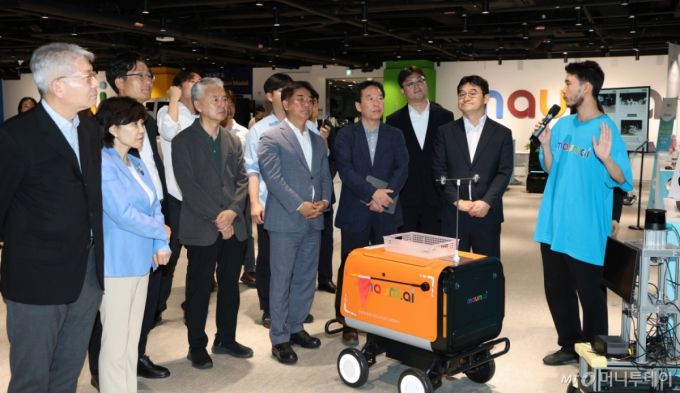 [성남=뉴시스] 김종택 기자 = 정태호 국정기획위원회 경제1분과 위원장과 분과·전문위원이 25일 오후 경기 성남시 수정구 마음AI 사옥을 방문해 다양한 피지컬 AI 로봇을 살펴보고 있다. (공동취재) 2025.06.25. /사진=김종택 |