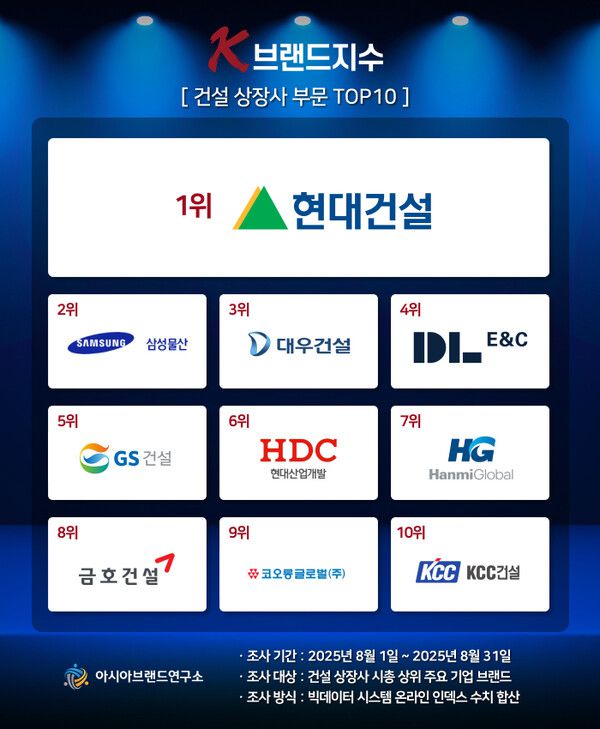 한정근 아시아브랜드연구소 대표는 "최근 정부의 주택 공급 확대 정책과 해외 인프라 투자 수요가 동시에 늘어나며 건설업계 브랜드 경쟁력이 강화되고 있다. 특히 대형사 중심의 안정적 실적 외에도 중견 건설사의 해외시장 진출과 스마트 건축 프로젝트가 주목받으며 브랜드 이미지 제고에 긍정적인 흐름을 보이고 있다"고 분석했다.