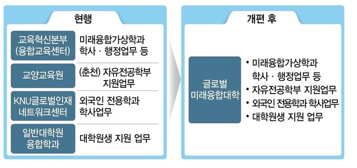 이에 기존 교육혁신 본부 소속 미래 융합 가상학과와 교양교육원 자유전공학부(춘천), KNU 글로벌 인재네트워크센터 외국인 전용학과(학사) 업무를 이관받아 통합 운영된다.