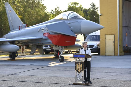 우르술라 폰데어라이엔 유럽연합 집행위원장을 태운 1일 루마니아 콘스탄차 인근 미하일 코갈니체누의 미하일 코갈니체누 공군기지 활주로에서 이륙하고 있다. 로이터=연합뉴스 |