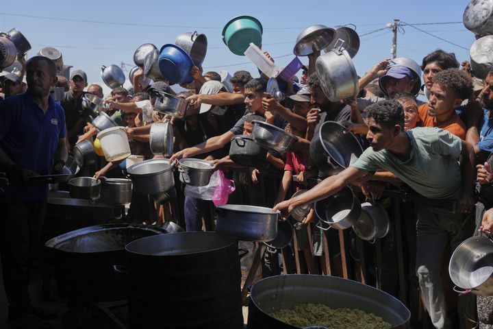 [칸유니스=AP/뉴시스] 1일(현지 시간) 가자지구 남부 칸유니스의 한 급식소에서 구호 음식을 받으려는 팔레스타인 주민들이 앞다퉈 모여들고 있다. 국제집단학살학자협회는 이날 이스라엘의 가자지구에서 행위가 대량 학살에 해당한다는 내용의 결의안을 채택했다. 2025.09.02. |