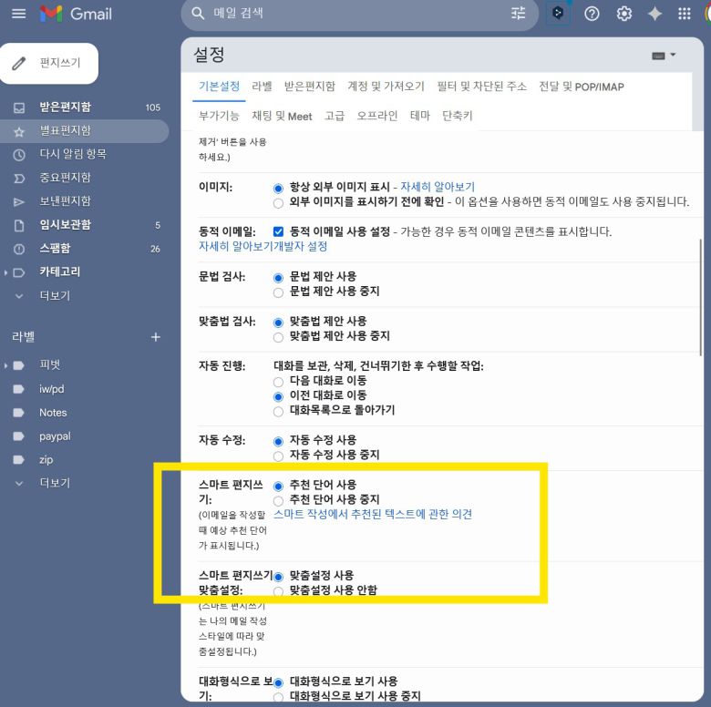 설정 > 모든 설정 보기 > 기본설정 탭으로 이동한 뒤, 아래로 스크롤하면 ‘스마트 편지쓰기’ 항목을 찾을 수 있다.