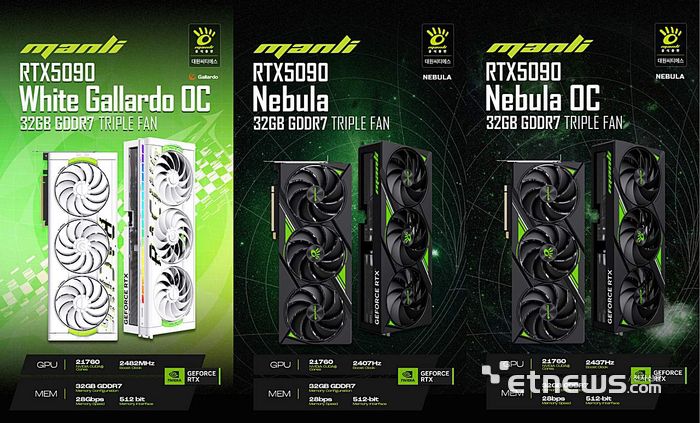 라인업은 △화이트 감성을 강조한 Manli GeForce RTX 5090 Gallado OC 32GB White △게이밍 환경을 겨냥한 Manli GeForce RTX 5090 Nebula 32GB △극한 성능에 초점을 둔 Manli GeForce RTX 5090 Nebula OC 32GB로 나뉜다.