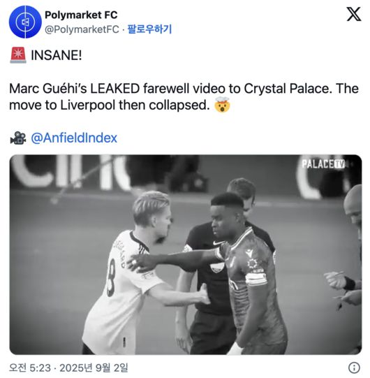 영국 '기브 미 스포츠'는 2일(한국시간) "리버풀 이적이 좌절된 직후, 게히의 팰리스 고별 영상이 소셜 미디어에 유출됐다. 모든 준비가 끝나 있었지만, 협상 결렬로 결국 수포로 돌아갔다"라고 보도했다.