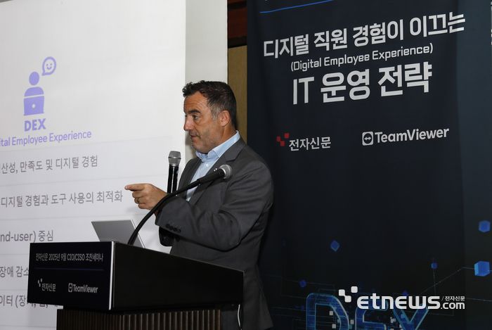 마크 밴필드 팀뷰어 최고매출책임자(CRO)가 2일 서울 삼성동 그랜드 인터컨티넨탈호텔에서 전자신문 주최로 열린 최고정보책임자(CIO)·최고정보보호책임자(CISO) 조찬 세미나에서 '팀뷰어 DEX'를 소개하고 있다. |
