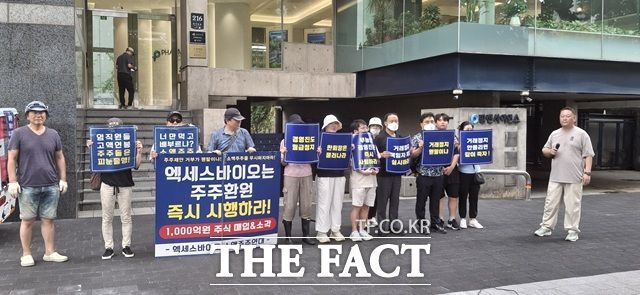 엑세스바이오 소액주주연대는 지난 1일 서울 서초구 팜젠사이언스 본사 앞에서 원주전환 비용 부담, 주주환원 미흡, 한의상 회장 퇴진, 거래정지 사태 책임자 처벌 등을 요구하며 집회를 열었다.