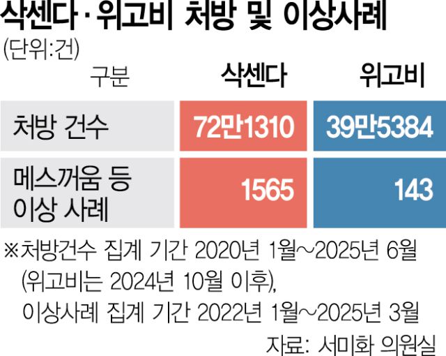 국내에서 집계된 통계에서도 부작용 관리가 필요하다는 점이 나타났다. 서미화 더불어민주당 의원이 건강보험심사평가원에서 받아 이날 발표한 자료에 따르면 2020년 1월부터 올해 6월까지 노보 노디스크의 비만치료제 ‘삭센다’와 위고비 처방 건수는 총 111만 6694건에 달했다. 특히 지난해 10월 국내 출시된 위고비는 9개월 만에 40만 건에 육박했다. 메스꺼움·구토·두통·주사부위 발진 등 이상사례는 삭센다가 1565건, 위고비가 143건 발생했다. 서 의원은 “비만치료제 처방이 크게 늘어나고 있는 만큼 불법·부적절한 처방을 막기 위한 관리·감독을 강화해야 한다”고 말했다.