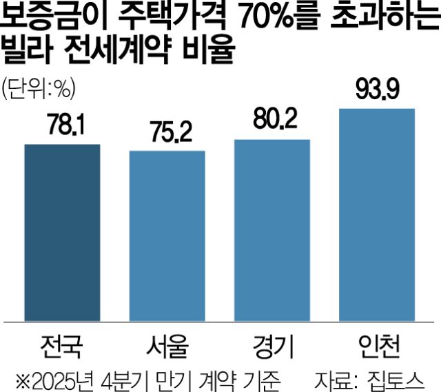 2일 부동산 중개·분석업체 집토스가 전세 계약 만료 시점이 오는 4분기(10∼12월)인 전국 빌라 전세 계약 2만4191건을 분석한 결과, 전세 보증 가입 요건이 주택 가격의 70%로 강화되면 이들 계약의 78.1%(1만8889건)가 보증 가입이 불가능해지는 것으로 나타났다. 구체적으로 인천 93.9%, 경기 80.2%, 서울 75.2% 등 수도권 빌라 계약의 대다수가 보증 가입 불가 대상에 포함됐다.