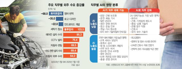 다만 화이트칼라와 블루칼라 직무 수요의 명암을 가른 것은 무엇보다 AI에 대한 직무 노출도와 학습 용이성의 차이라고 업계는 설명한다. 김해성 숨고 최고전략책임자(CSO)는 “집수리나 에어컨 수리 등 가정이나 매장을 방문해 수행하는 직무의 경우 집의 구조나 배치·연결방식 등이 제각각이라 표준화하기 어려운 특성이 있다”며 “이런 점에서 AI가 확산되더라도 홈앤리빙 분야 기술 인력의 경우 계속해서 고객들의 수요가 지속될 수 있다”고 전망했다. 달리 말하면 사무직군의 경우 이미지나 외국어 텍스트, 코딩 등 생성형AI가 쉽게 접근할 수 있고 학습 데이터가 충분한 직무가 많아 더 많은 영향을 받고 있다는 설명이다.