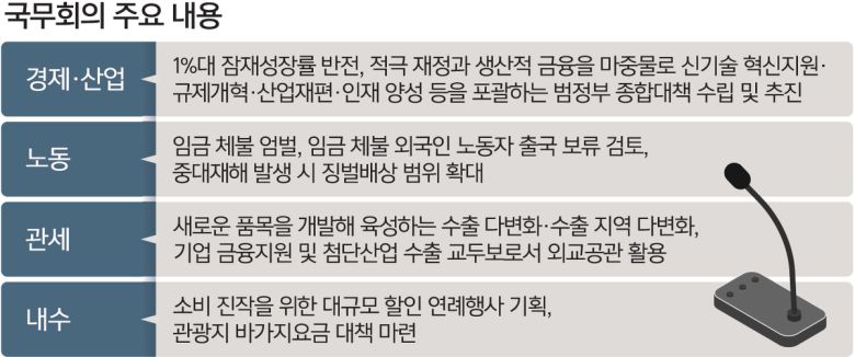 각 부처 장관이 먼저 성장 전략 관련 보고를 한 후 이 대통령과 국무위원들 간에 토론이 이어지는 방식으로 진행된 이날 국무회의에서 이 대통령은 성장과 동시에 임금체불·산업재해 등의 문제도 신경쓰며 균형 잡힌 성장을 이뤄 나가야 한다는 점을 강조했다.