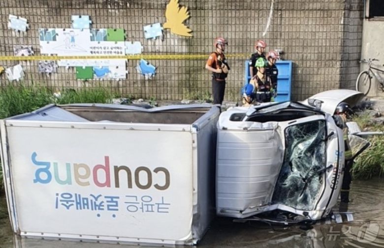 다리 아래로 추락한 택배 배송 트럭