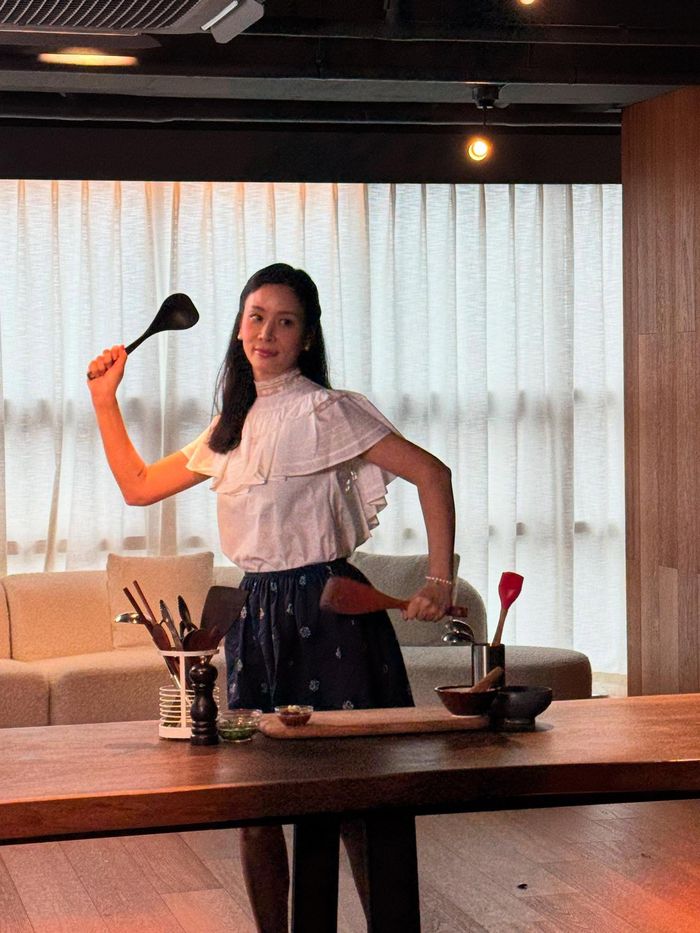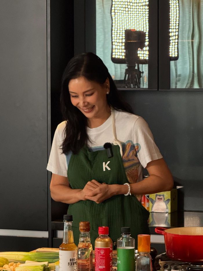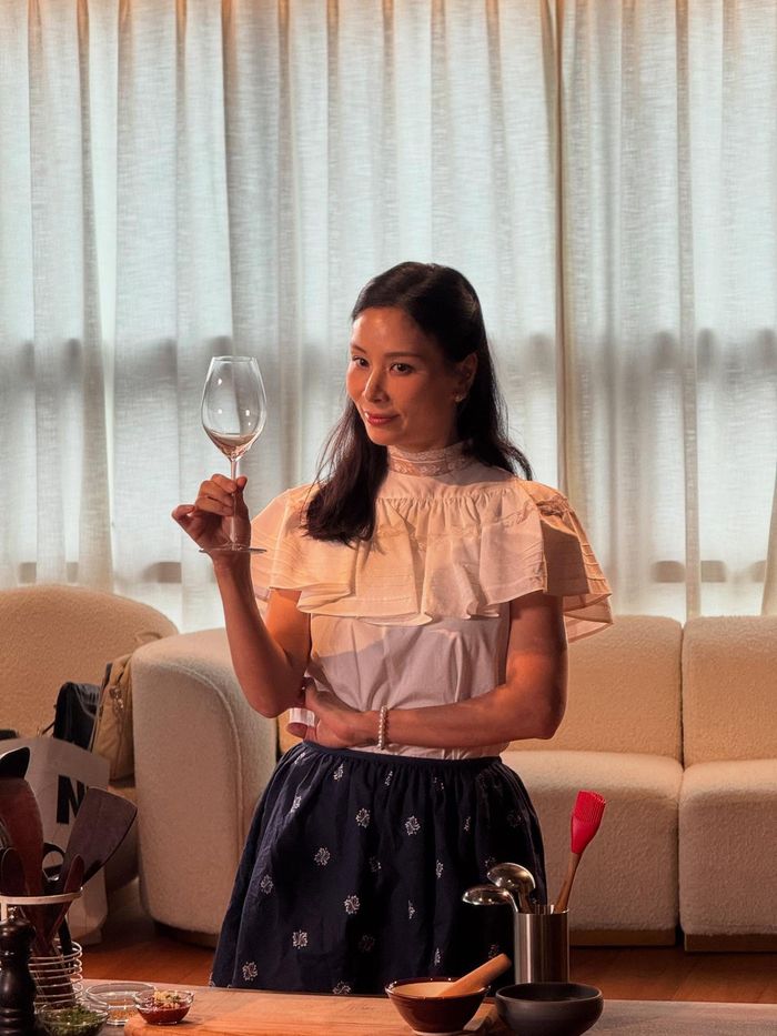 또 다른 사진 속 고소영은 세련된 실내 공간에서 와인을 맛보거나 요리에 몰두하는 모습이다.