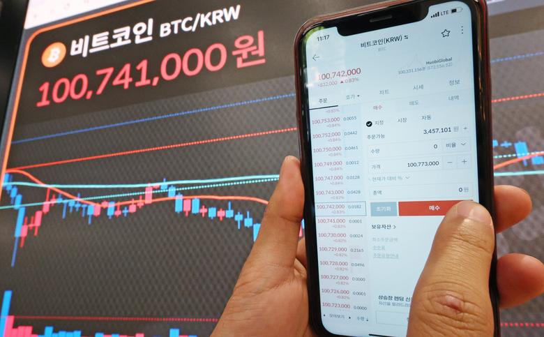 서울 서초구 빗썸라운지에서 직원이 개당 1억 원을 돌파한 비트코인의 가격을 살펴보고 있다. /뉴스1 |