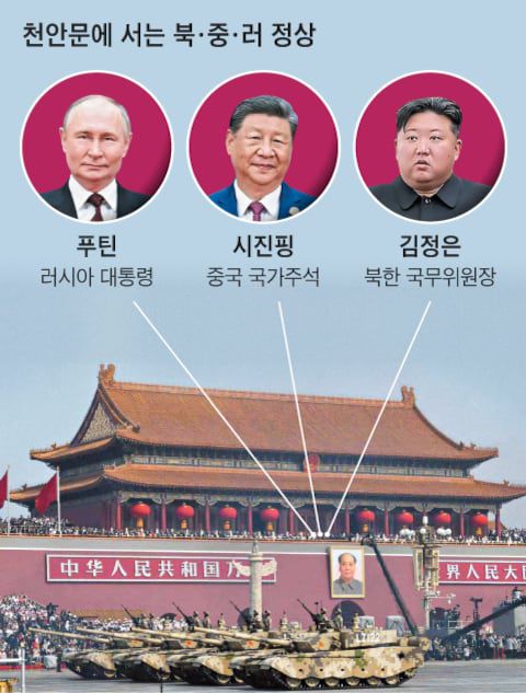 천안문 망루 주석단의 VIP 좌석은 시진핑 중국 국가주석 오른쪽에 러시아 블라디미르 푸틴 대통령, 왼쪽엔 김정은 북한 국무위원장이 앉게 될 것이라고 러시아 크렘린궁 관계자와 한국 국가정보원이 밝혔다. 이 자리엔 이란의 마수드 페제시키안 대통령, 미얀마 군사정권의 수장인 민 아웅 흘라잉, 콩고공화국의 드니 사수응게소 대통령 등 총 26국 정상(중국 포함)이 참석한다. 미 뉴욕타임스(NYT)는 “중국·러시아·북한·이란 4국 정상이 한자리에 모이는 것은 역사상 처음”이라고 했다.