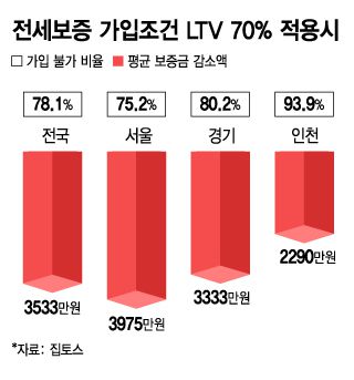 전세보증 가입이 사실상 필수 조건인 시장 상황에서 보증 가입이 막히면 임대인은 신규 임차인을 구하기 어려워진다. 보증 기준을 충족하려면 계약당 평균 3533만원의 보증금을 낮춰야 한다. 서울은 3975만원, 경기는 3333만원, 인천은 2290만원 수준이다.
