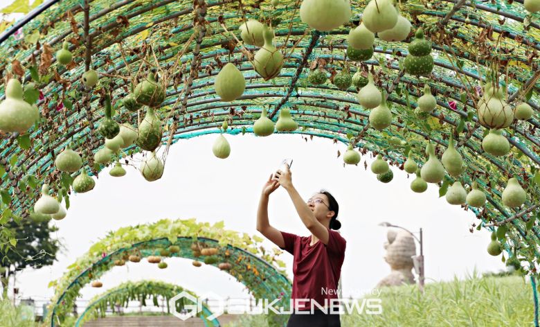 (서울=국제뉴스) 한 시민이 조롱박, 호박 등 덩굴식물로 꾸며진 터널에서 폰 카메라로 사진을 찍고 있다./사진=이용우기자 |