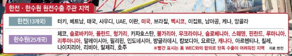 이에 한전은 미국·아랍에미리트(UAE)·베트남 등 13개국, 한수원은 체코와 루마니아, 필리핀, 캐나다 등 25개국을 맡아 수주 활동을 펼쳐 왔다. 한국형 원전을 그대로 쓸 수 있는 국가는 한전이 담당하고, 설계 변경이 필요한 국가는 한수원이 주도하는 방식이다.
