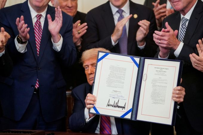 도널드 트럼프 미국 대통령이 7월18일(현지시간) 워싱턴DC 백악관에서 서명한 '지니어스 법안'(Genius Act, Guiding and Establishing National Innovation for U.S. Stablecoins Act)을 들어 보이고 있다. 지니어스 법안은 디지털 자산인 스테이블코인을 제도화하기 위해 연방 정부 차원의 규제 프레임워크를 개발하고 업계 감독을 확대하는 등의 내용을 담고 있다. /로이터=뉴스1 |