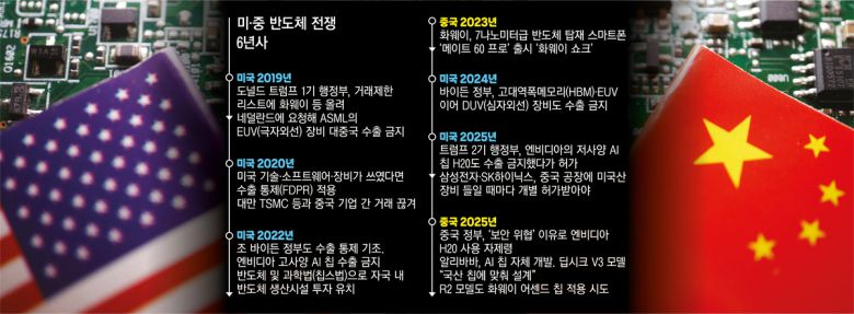미·중 반도체 전쟁은 2019년 5월 도널드 트럼프 1기 행정부가 중국 기업 화웨이를 거래제한 블랙리스트(엔티티 리스트)에 올리며 시작됐다. 미국에겐 자국 기업과 화웨이 간 거래 차단은 물론 대만 TSMC 같은 타국 기업과 화웨이 간 거래까지 가로막은 결정적 무기가 있었다. 미국의 기술·소프트웨어·장비가 사용됐다면 해외 기업 제품이라 해도 미국의 수출통제 규제를 받도록하는 FDPR(해외직접생산품 규칙)이다. TSMC에 반도체 공정을 기대고 있던 화웨이에겐 날벼락이었다. 화웨이의 자회사인 하이실리콘의 글로벌 AP(스마트폰용 반도체) 점유율이 5분의 1토막이 났다. “반도체가 석유와 비슷한 영향력을 갖고 있음이 드러난 순간”(정인성 작가·‘반도체의 제국’ 저자)이었다.