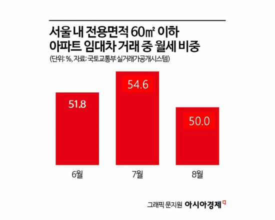3일 국토교통부 실거래가 공개시스템에 따르면 지난 7월 서울 내 전용면적 60㎡ 이하 소형 아파트 임대차 거래 중 월세 비중은 54.5%로 집계됐다. 이는 전월 51.8%와 비교할 때 2.7%포인트 상승한 수치다.