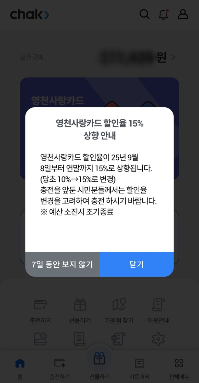 지역 상품권 ‘chak’ 앱 내 영천사랑상품권 할인 판매 안내문 [사잔=영천시] |