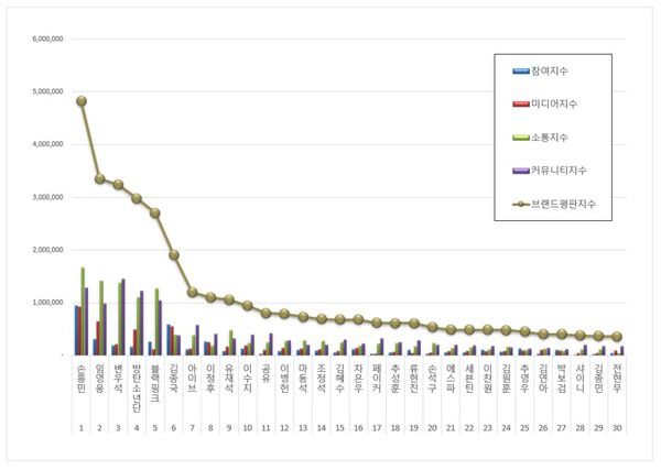 2위, 임영웅 브랜드는 참여지수 310,500 미디어지수 650,521 소통지수 1,409,731 커뮤니티지수 978,720이 되면서 브랜드평판지수 3,349,472로 분석됐다. 지난 8월 브랜드평판지수 1,593,895와 비교해보면 110.14% 상승했다.