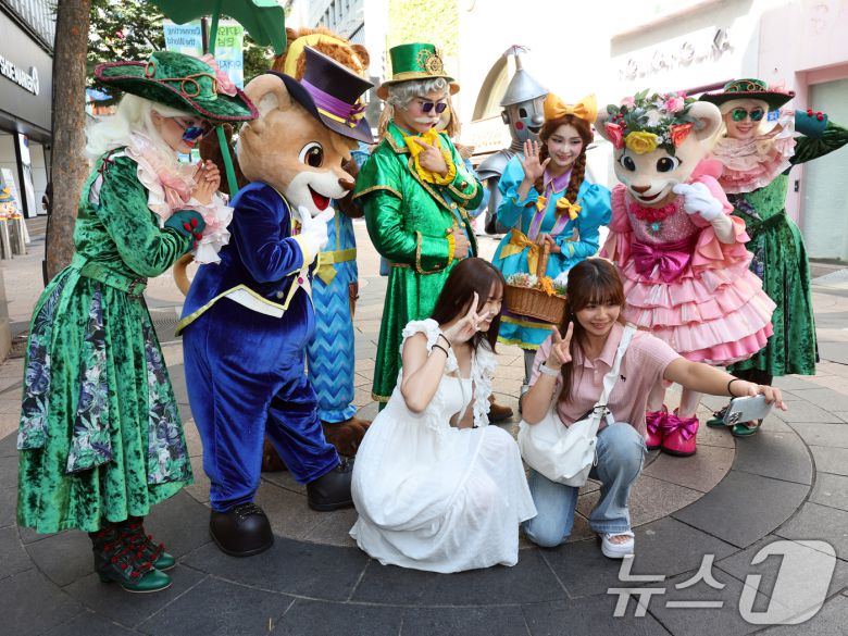 (서울=뉴스1) 황기선 기자 = 3일 서울 중구 에잇세컨즈 명동점 앞에서 소설 '오즈의 마법사' 캐릭터가 외국인 관광객들과 기념촬영을 하고 있다. 삼성물산은 오는 5일부터 11월 16일까지 가을축제 '에버랜드 오브 오즈'를 개최한다. 2025.9.3/뉴스1