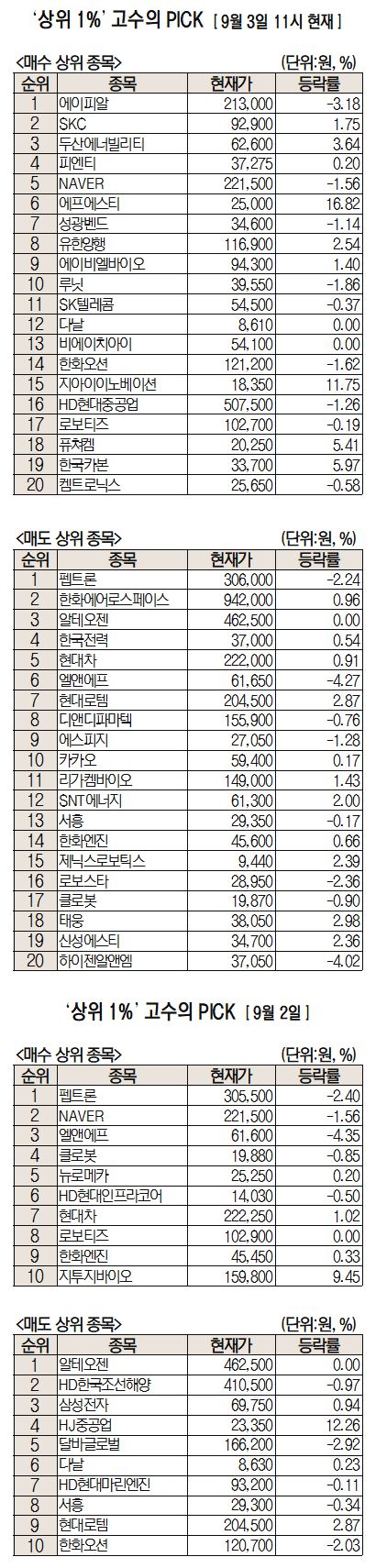 미래에셋증권은 자사 고객 중에서 지난 1개월간 수익률 상위 1% 투자자들의 매매 종목을 집계해 실시간·전일·최근 5일 기준으로 모바일트레이딩시스템(MTS) 상에서 공개하고 있다. 이 통계 데이터는 미래에셋증권의 의견과 무관한 단순 정보 안내이며 각각의 투자자 개인에게 맞는 투자 또는 수익 달성을 보장하지 않는다. 또 테마주 관련 종목은 이상 급등락 가능성이 있으므로 유의해야 한다.