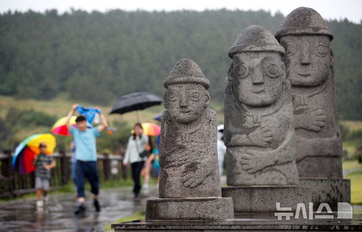 [서귀포=뉴시스] 우장호 기자 = 제주 서귀포시 대정읍 송악산 둘레길에서 우산을 쓴 관광객들이 걸어가고 있다. (뉴시스DB)