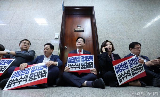 의원들은 규탄대회 직후 원내대표실 앞으로 이동해 '야당 탄압 정치보복 압수수색 중단하라'는 문구가 적힌 피켓을 들고 연좌 농성을 벌이고 있다. 이 과정에서 일부 의원들은 특검팀의 국회 본과나 진입을 도운 방호과 직원을 향해 거센 항의를 하기도 했다.