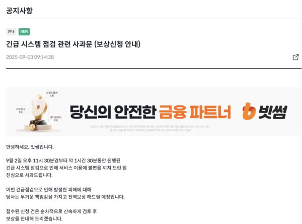 3일 빗썸은 공지사항을 통해 거래 정지에 따른 피해 보상을 발빠르게 진행하겠다는 의지를 드러냈다. 빗썸 측은 "9월 2일 오후 11시 30분경부터 약 1시간 30분동안 진행된 긴급 시스템 점검으로 인해 서비스 이용에 불편을 끼쳐 드린 점 진심으로 사과드린다"고 말했다. 피해 보상은 회원들이 직접 피해 내역을 접수하면, 빗썸이 심사를 거쳐 보상금을 지급하는 절차로 진행된다.