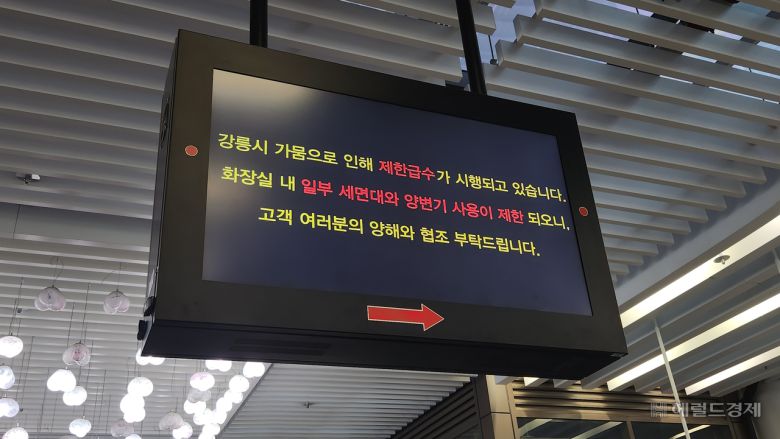 지난 2일 강원도 강릉 KTX역 스크린에 가뭄 재난사태 관련 안내 공지가 올라와있는 모습. 강릉시는 사상 최악의 가뭄으로 수도 계량기의 75%를 잠그는 제한급수 조치를 시작했다. 안효정 기자.