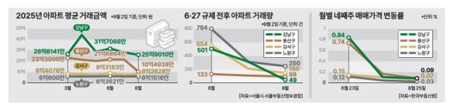 이들 지역의 아파트 거래량도 급감했다. 용산구의 8월 아파트 매매 거래량은 98건으로 6월(133건) 대비 26.3% 줄었다. 강남구는 같은 기간에 501건에서 49건으로 감소하며 사실상 거래 절벽이 나타났다.