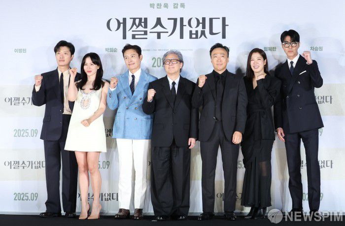 [서울=뉴스핌] 김학선 기자 = 박찬욱 감독을 비롯해 출연배우들이 19일 서울 용산구 CGV 용산아이파크몰에서 열린 영화 '어쩔수가없다' 제작보고회에서 포즈를 취하고 있다. 왼쪽부터 배우 박희순, 손예진, 이병헌, 박찬욱 감독, 배우 이성민, 염혜란, 차승원. '어쩔수가없다'는 모든 것이 만족스러웠던 회사원 만수가 갑작스러운 해고 이후 가족과 집을 지키기 위해 재취업 전쟁에 뛰어드는 이야기를 그린다. 2025.08.19 yooksa@newspim.com |