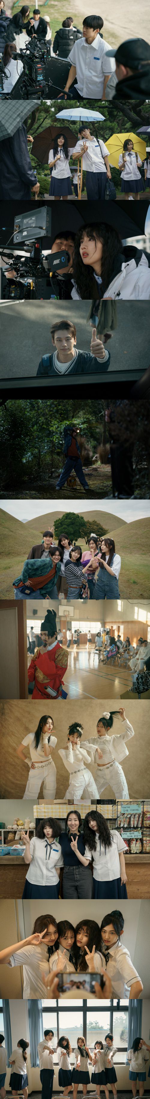 풍성한 곱슬머리를 자랑하는 신은수와 세리의 라이벌 고인정 역의 강미나, 남궁선 감독의 모습은 '고백의 역사'만의 사랑스러운 매력을 배가시킨다. 여기에 더해, 교실과 수학여행에서 찍은 단체 사진은 청량하고 싱그러운 에너지를 전하며 화기애애하고 웃음이 가득했던 촬영 현장의 분위기를 짐작하게 한다.